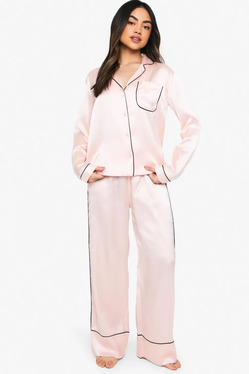 Contrast Piping Satin Long Sleeve Shirt & Trousers Pyjama Set | Nasty Gal