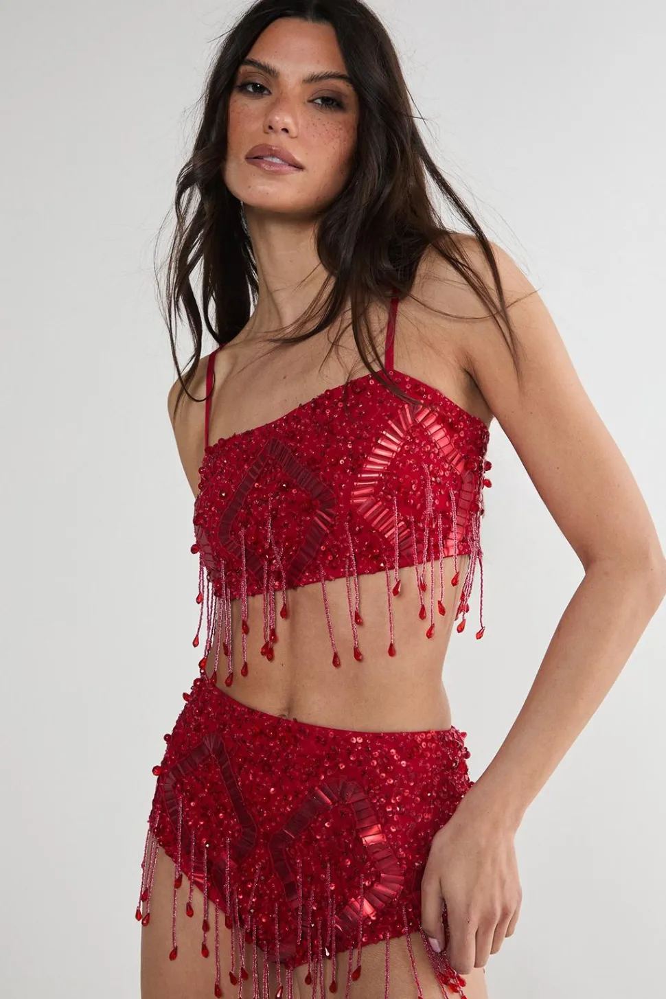 Party time. Feel dancefloor ready in our crop top, with beaded detailing, fun fringe, and an edgy, boxy design. Style it with the matching booty shorts and your failsafe boots for a look that will take you from festival weekends to rave nights.