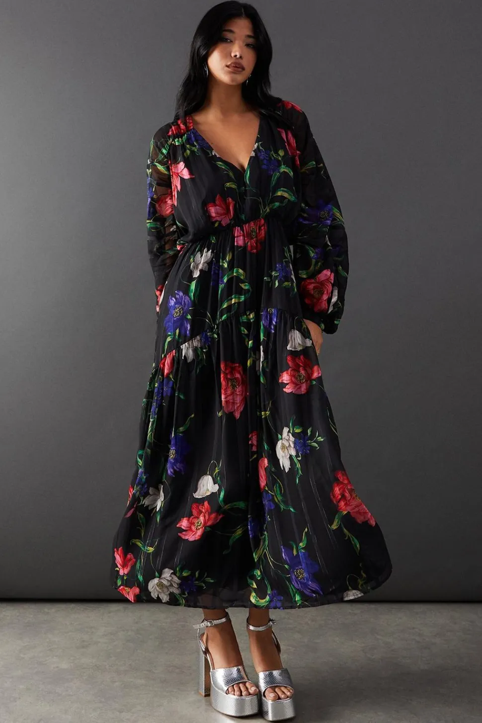 Floral Shadow Stripe Chiffon Plunge Neck Tier Midi Dress | Nasty Gal