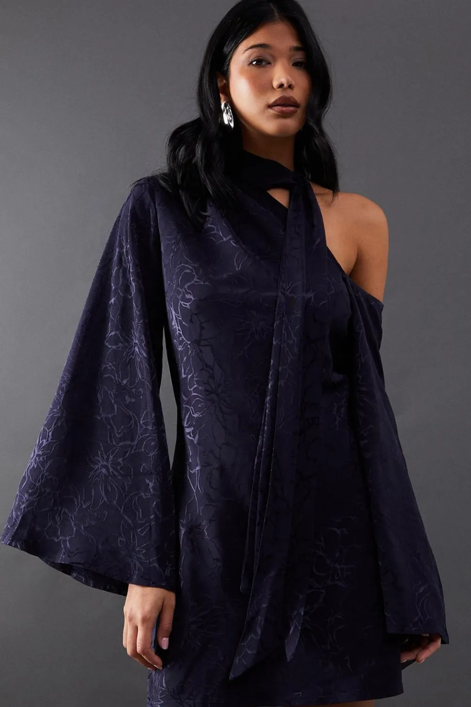 Be the first to review “Petite Satin Jacquard Tie Neck Asymmetric Shoulder Mini Dress | Nasty Gal” Cancel reply
