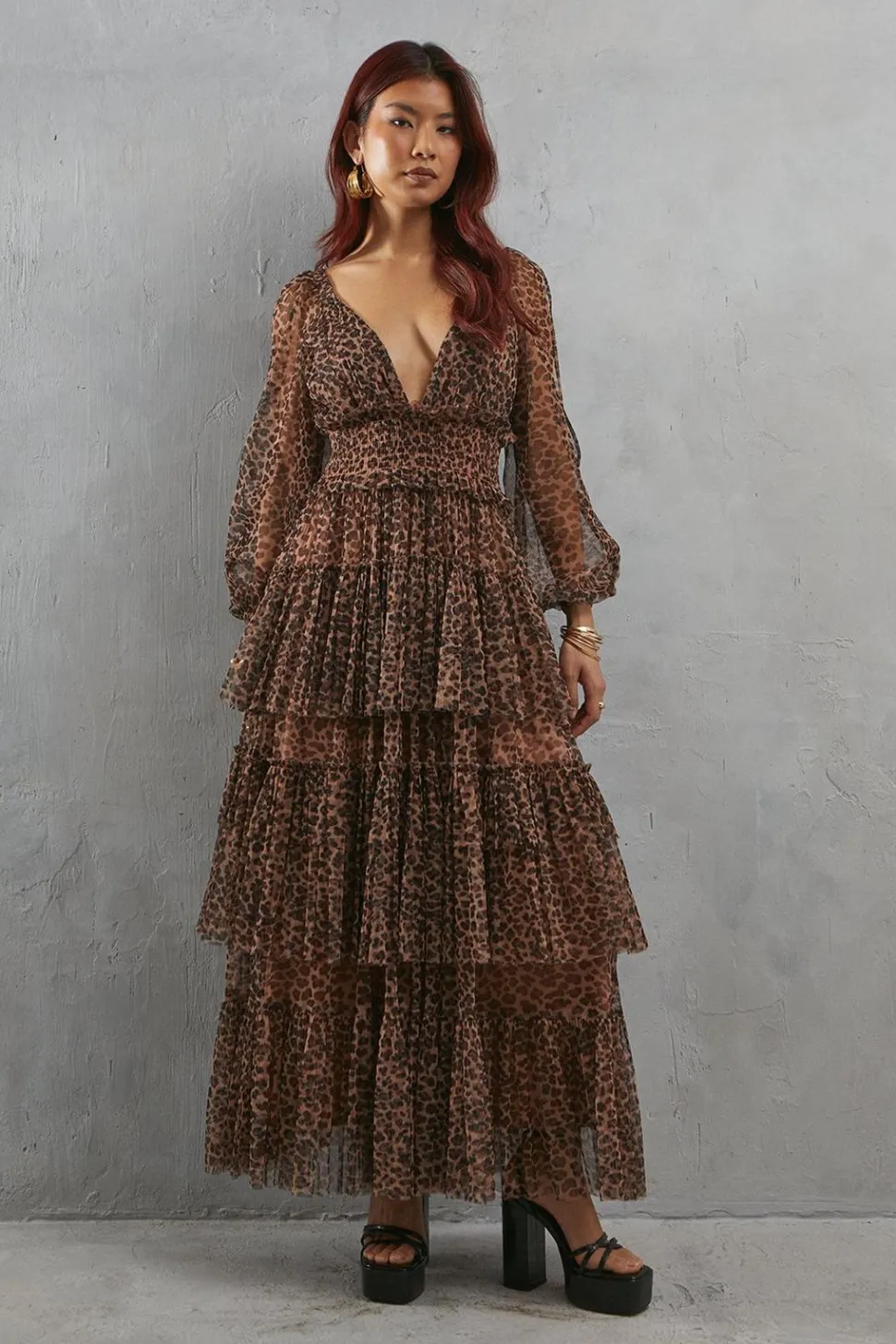 Tulle Leopard Print Plunge Neck Long Sleeve Tier Maxi Dress | Nasty Gal